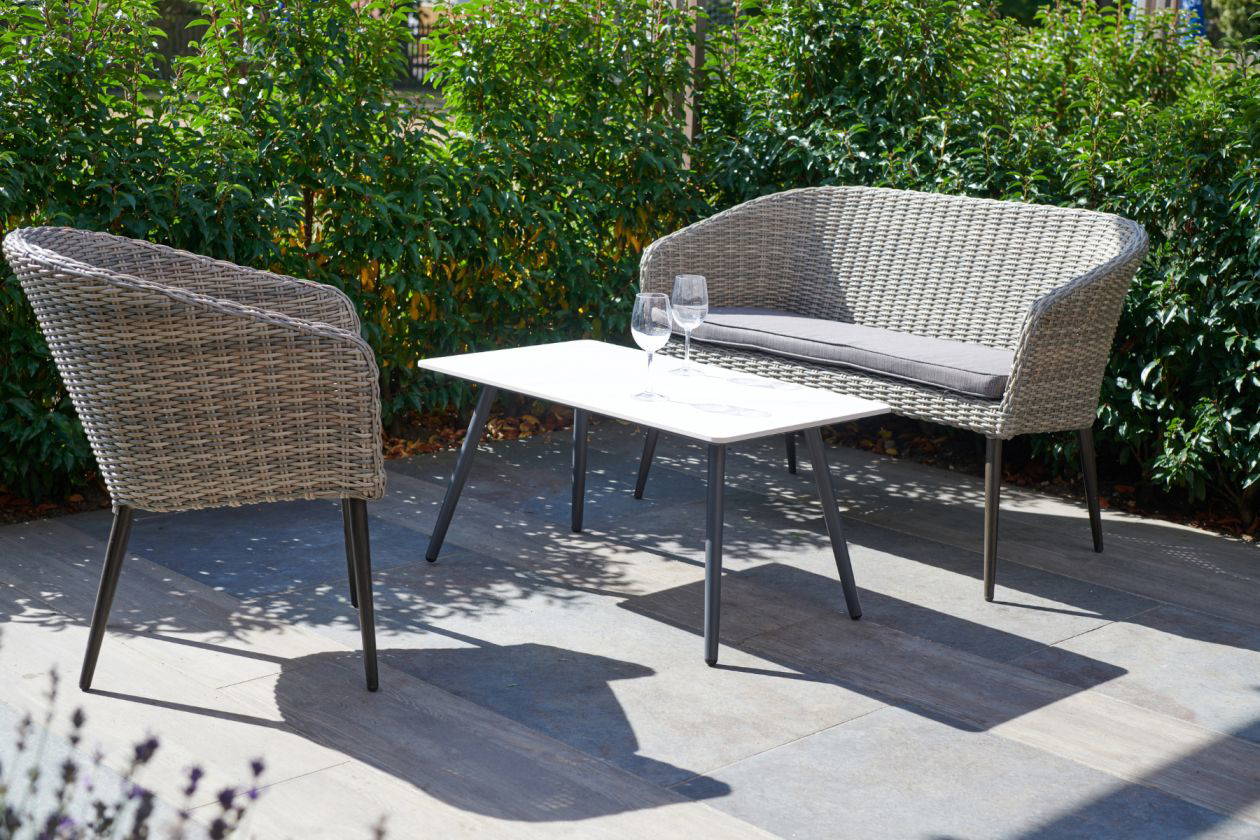 The Hanover Sofa is a contemporary design, with a water-resistant rattan weave and aluminium frame. Stackable for easy storage.