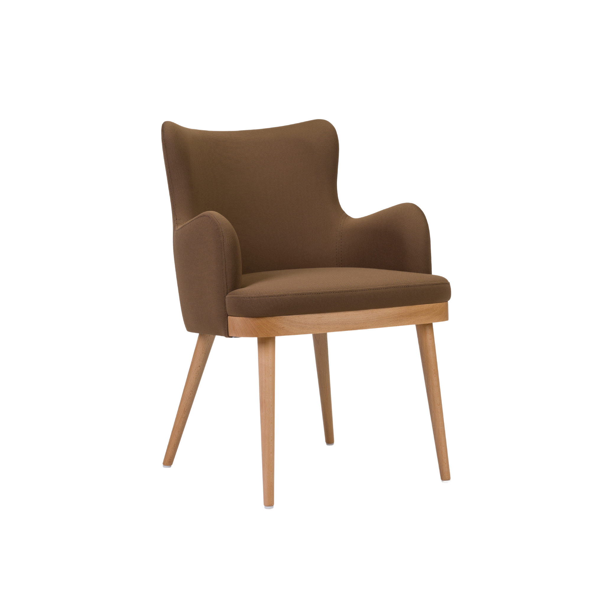The Kelly Flow Armchair features a natural wood frame with fully upholstered seat and a curved backrest for ergonomic comfort.