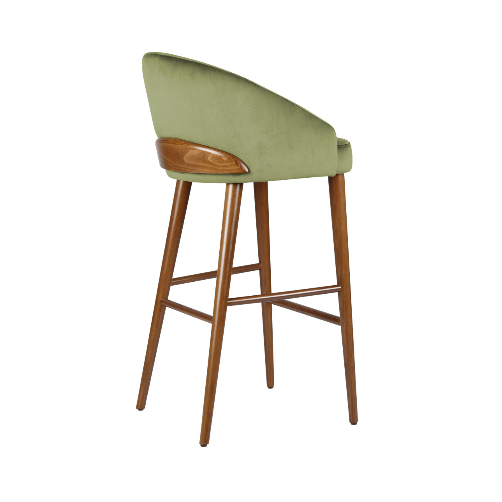 The Kelsey Wood High Stool offers a contemporary style with modern, show-wood detailing, and full upholstery. Great for refined hotels, bars, and dining spaces.